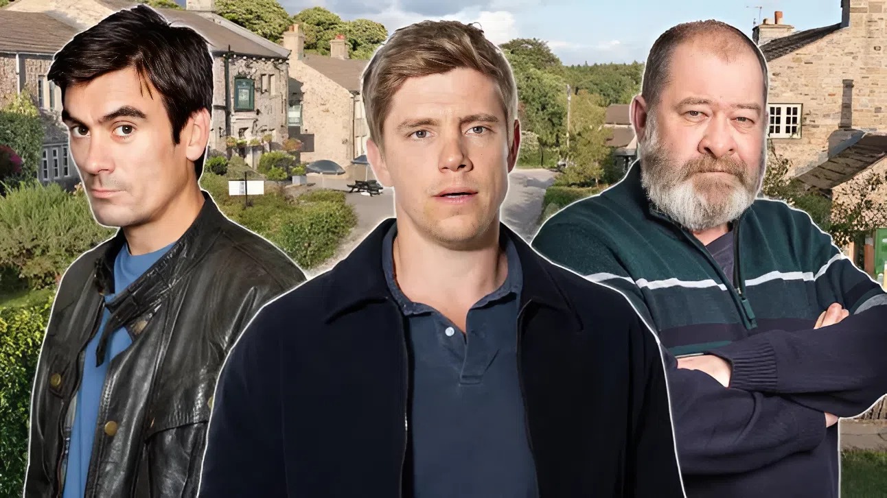 An Emmerdale collage that features Cain Dingle, Robert Sugden and Bear Wolf in front of the village.