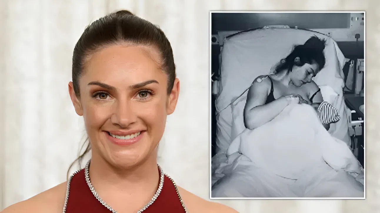 A close-up of Isabel Hodgins smiling, next to a snap of her in a hospital bed holding her newborn baby after giving birth.
