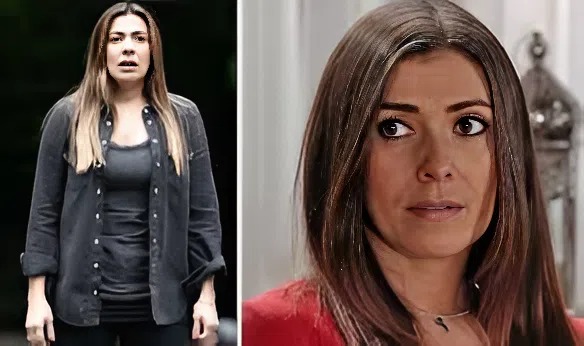 Michelle Connor standing in the middle of a road looking horrified in Coronation Street.