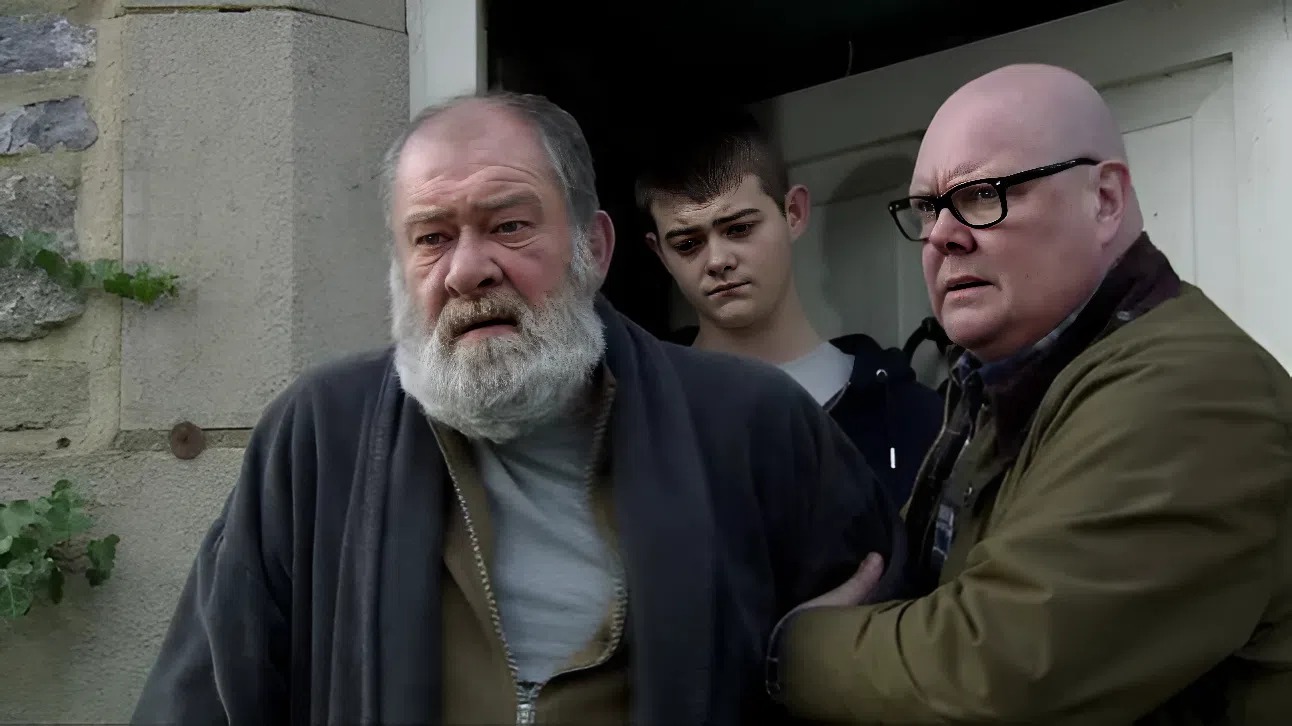 But Ray was mistaken to think he had seen Bear’s dead body. Bear was very much alive and made a timely entrance at Tenant House where son Paddy Kirk (Dominic Brunt) was being beaten to a pulp.