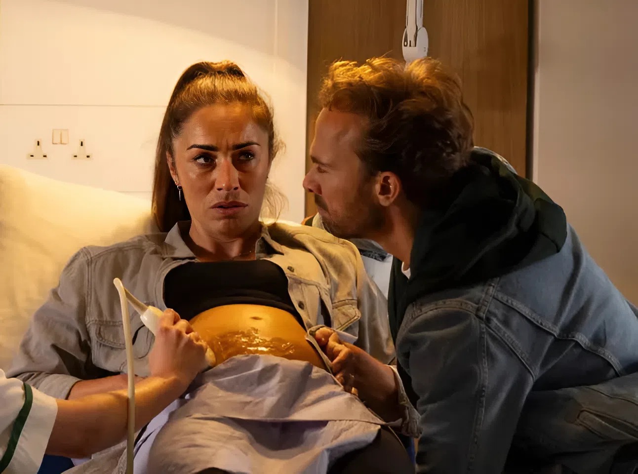 David and Shona looking worried during Shona's ultrasound in Corrie